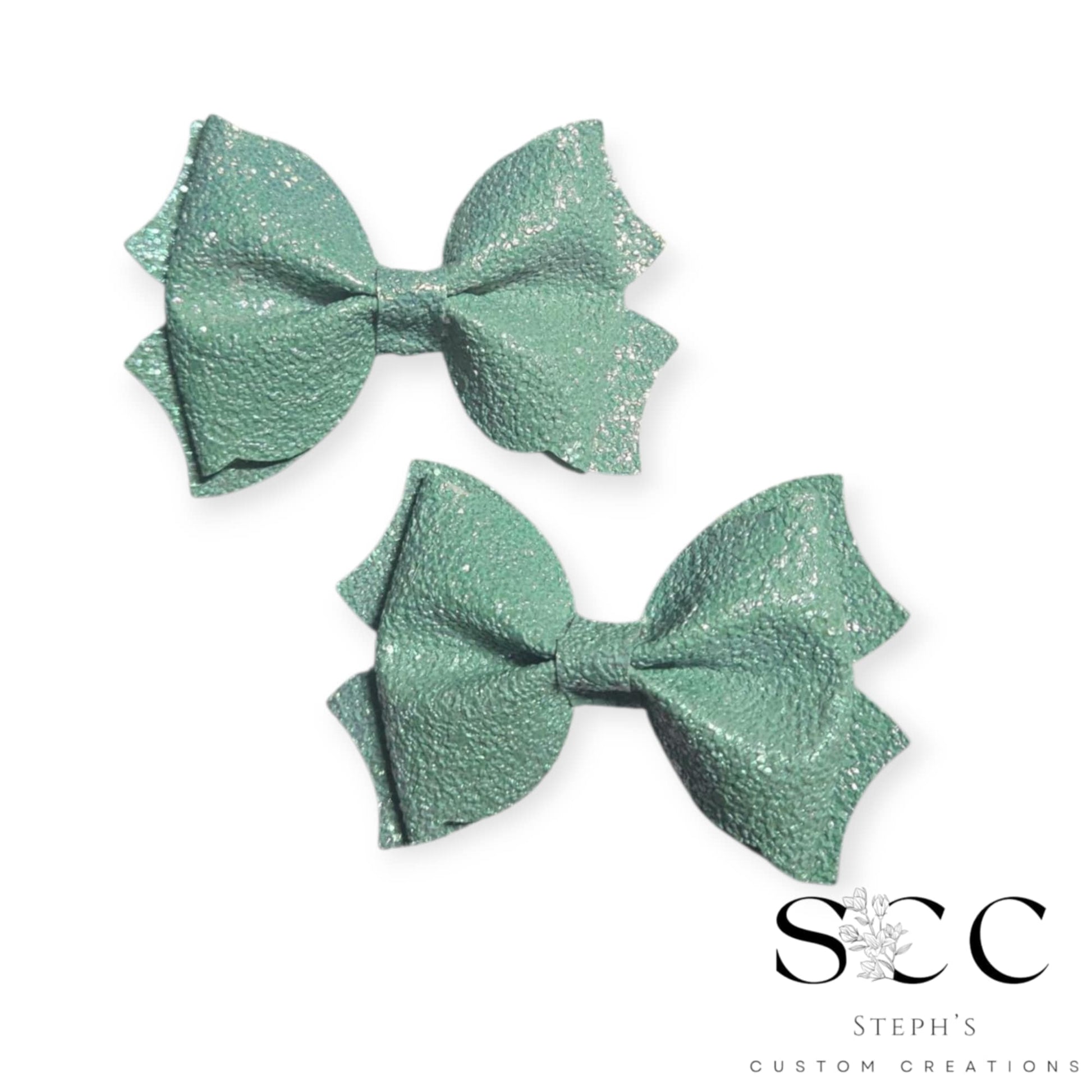 Chic and full of sparkle, the Audrey 3" Pigtail Bows are the perfect finishing touch for your little fashionista. Made with shimmering, color-shifting glitter fabric that dances between shades of pink, purple, and teal under the light, these bows add a stylish pop to any outfit. The unique sculpted shape gives them a touch of elegance while keeping them playful and fun. Ideal for pigtails, half-ups, or clipped into braids—these versatile bows are handmade with love by Steph’s Custom Creations.
