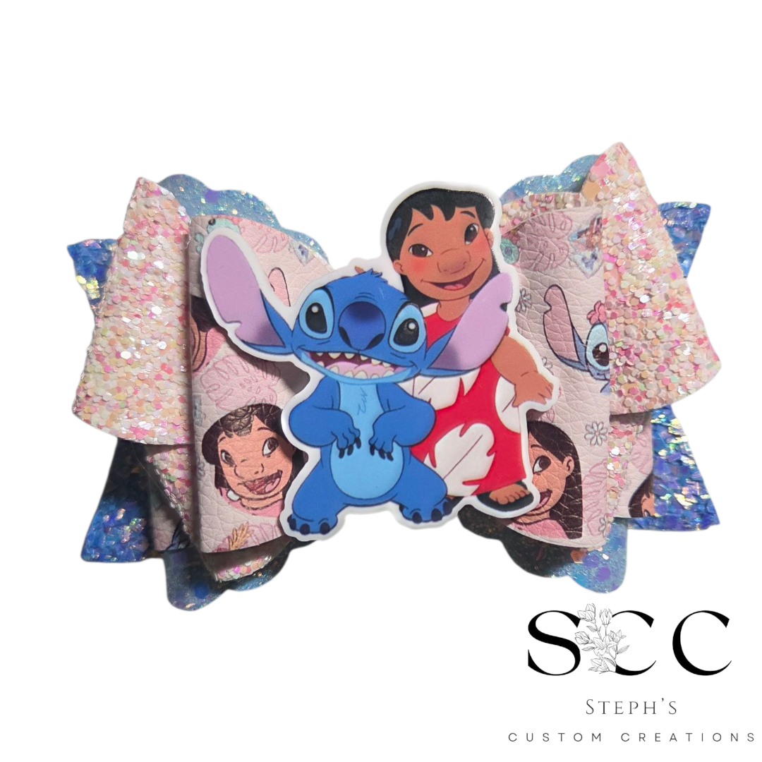 Make a statement with our Alina 4.5" Bow featuring the iconic Blue Alien duo. Centered with an eye-catching Lilo & Stitch embellishment, this bow shines with a mix of glittering white, pastel rainbows, and bold character prints. With a sturdy, multi-layered design and sparkling flair, the Alina bow is perfect for fans who love a bit of whimsy and sparkle in their accessories.