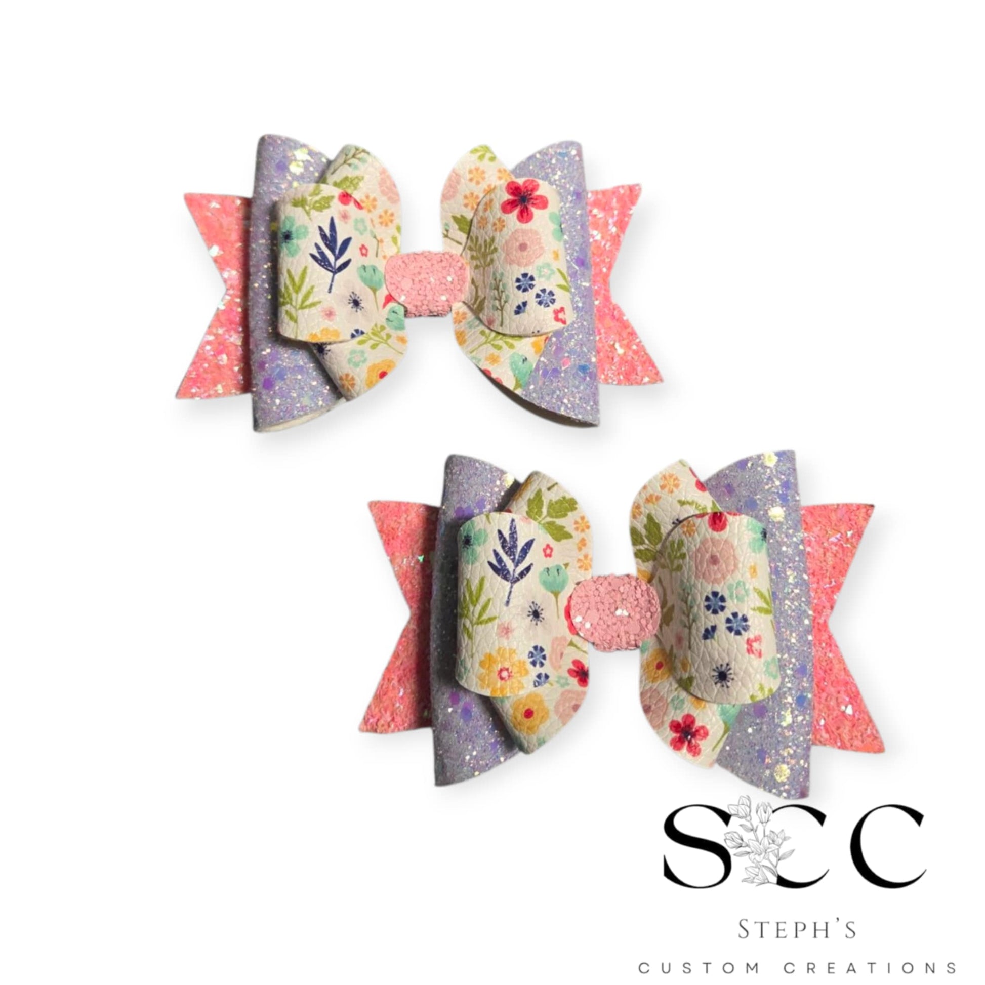 Whimsical and full of charm, the Theresa 4" Pigtail Bows are a sweet celebration of color and florals! These double-layered bows feature a vibrant floral print with delicate details, paired with glittery lilac and coral pink backing for a soft shimmer that catches the light. Finished with a pink glitter center, this set adds a playful yet pretty touch to any hairstyle. Perfect for spring outfits, garden parties, or just brightening up the everyday. Lovingly handmade by Steph’s Custom Creations.