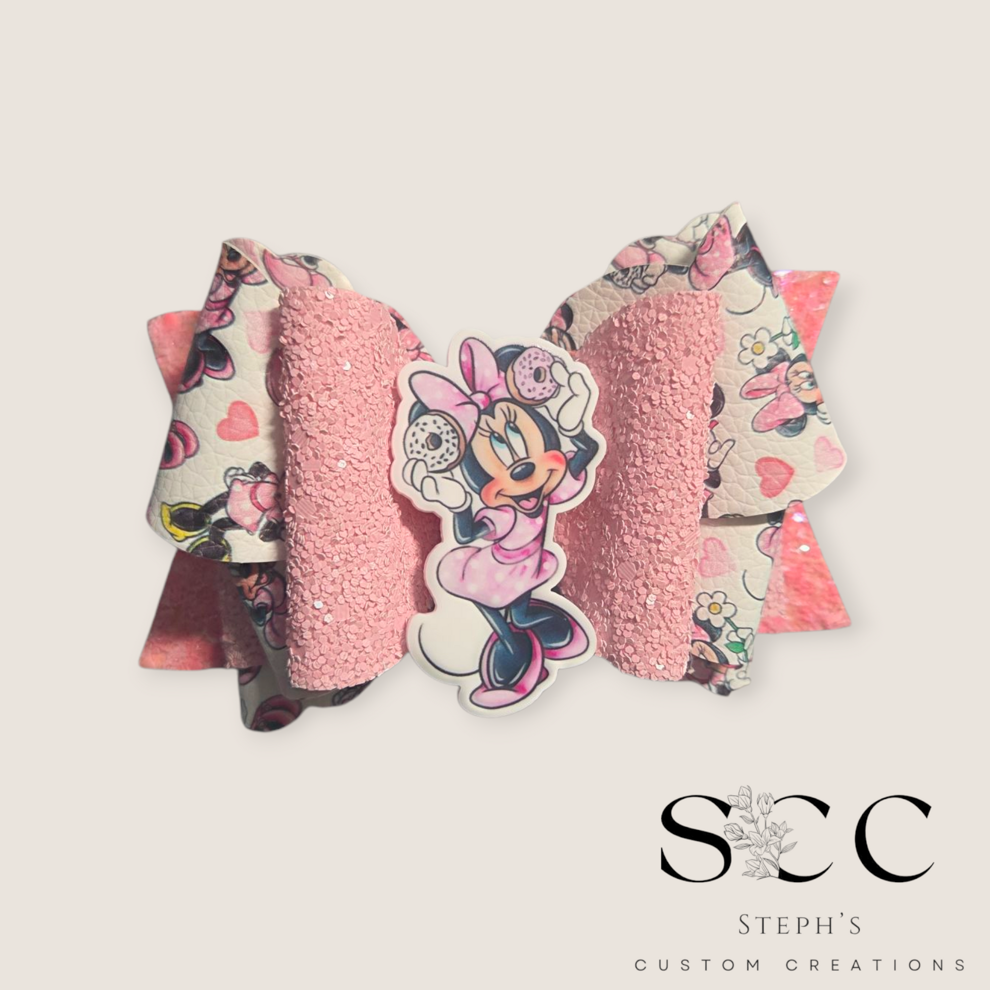 Bring a pop of playful charm to any hairstyle with our Alina 4.5" Bow. This layered beauty features soft pink glittery faux leather and a lively print showcasing a sweet character in pink tones. Crafted for both style and comfort, Alina makes a bold yet elegant statement — perfect for little fashionistas who love sparkle and fun.