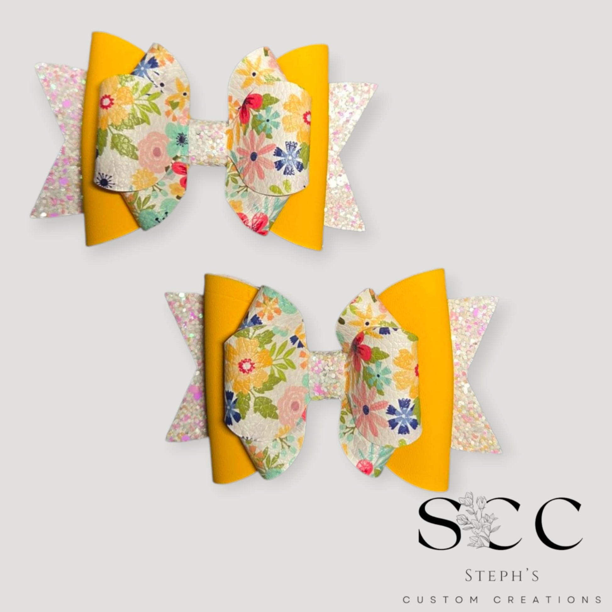 Add a pop of sunshine to your little one's look with this adorable pigtail bow set! Featuring bright yellow faux leather, sparkly glitter tails, and a vibrant floral print with charming daisies, these 4" Theresa-style bows are perfect for spring and summer days. Whether for playful outings or special occasions, this sweet and sunny duo is sure to brighten up any hairstyle.